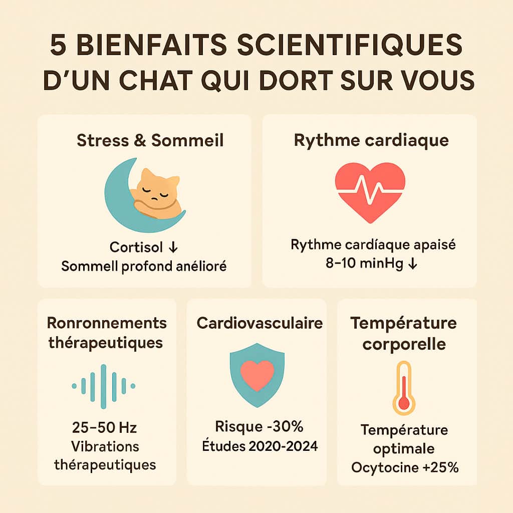 - Réduction de la pression artérielle : une étude menée par l’Université du Minnesota en 2023 démontre que les propriétaires de chats dormant régulièrement avec leur animal présentent une diminution moyenne de 8 à 10 mmHg de leur tension systolique, optimisez cet effet en pratiquant une respiration consciente pendant que votre chat ronronne sur vous