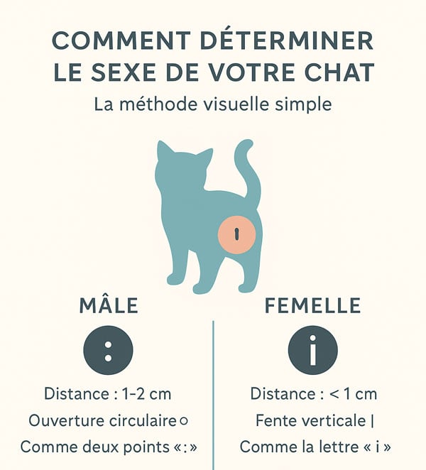 Chez le chat mâle, vous verrez deux ouvertures circulaires espacées d’environ 1 à 2 cm, formant visuellement deux points « : ». Chez la chatte, l’anus et la vulve (une fente verticale) sont séparés de moins de 1 cm, évoquant plutôt un point d’exclamation inversé « i ». Cette observation visuelle reste fiable dès les premières semaines de vie, même si les testicules ne deviennent vraiment visibles qu’entre 8 et 12 semaines. Attention aux pièges : la couleur du pelage (comme les robes écaille de tortue) ou le comportement ne constituent pas des indicateurs absolus, et une manipulation inadaptée peut stresser l’animal ou fausser votre diagnostic.