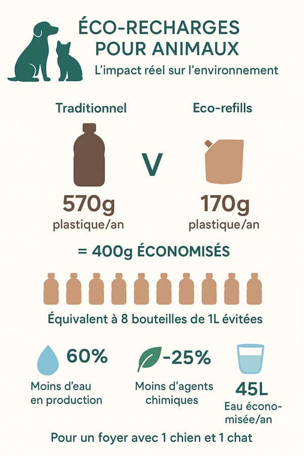 Les éco-recharges permettent de réduire jusqu’à 70% le plastique utilisé pour les produits de soins animaliers, tout en générant des économies moyennes de 20 à 30% sur vos achats annuels de shampoings, nettoyants et autres produits d’hygiène pour vos compagnons. Pour un foyer avec un chien et un chat, cela représente entre 15 et 25 euros économisés par an, et environ 400 grammes de plastique évité. Le lien avec le bien-être animal ? Les formulations concentrées des éco-recharges contiennent en général moins d’agents de remplissage et de conservateurs superflus, réduisant ainsi les risques d’irritations cutanées chez nos compagnons. Attention toutefois : tous les produits étiquetés « éco-recharge » ne se valent pas, et certains affichent même un prix au litre supérieur à leur version classique.