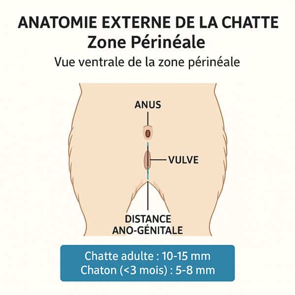 Chez une chatte en bonne santé, la vulve se situe juste sous l’anus, à environ 1 à 1,5 cm de distance, et se présente comme une petite fente verticale de couleur rose pâle. Cette distance ano-génitale constitue le repère principal pour différencier un chaton femelle d’un mâle : chez ce dernier, l’ouverture génitale apparaît circulaire et se trouve à environ 2 cm de l’anus. L’appareil reproducteur externe d’une chatte saine ne présente ni gonflement, ni écoulement, ni rougeur excessive. Les signes d’alerte qui nécessitent une consultation vétérinaire immédiate incluent des écoulements purulents ou sanglants, une vulve anormalement gonflée, un léchage compulsif de la zone génitale, ou des symptômes généraux comme l’abattement et la perte d’appétit, qui peuvent signaler un pyomètre, une infection utérine potentiellement mortelle touchant particulièrement les chattes non stérilisées après leurs chaleurs.