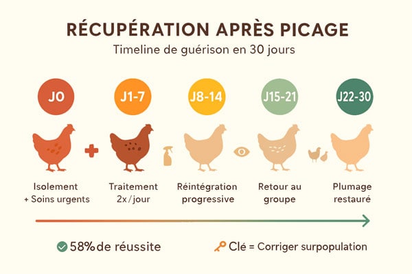 Jours 22-30 (récupération complète) : les plumes de couverture (grandes plumes) repoussent et le plumage retrouve 70-80% de son aspect initial. La poule présente un comportement totalement normal, participe aux bains de poussière collectifs et aux activités de groupe. La hiérarchie est stabilisée. Indicateur vert foncé : plumage en reconstruction avancée, comportement social équilibré. Actions : retour au protocole de surveillance mensuel standard, bilan des modifications apportées (noter ce qui a fonctionné), planification de la prochaine vérification complète dans 30 jours.