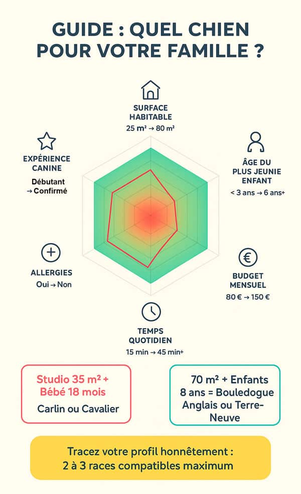 Chaque famille possède un profil unique qui oriente vers deux ou trois races compatibles maximum. Visualisez six axes formant une étoile : le premier mesure votre surface habitable (de 25 m² en rouge à 80 m²+ en vert), le deuxième évalue l’âge de votre plus jeune enfant (moins de 3 ans en orange, 6 ans et plus en vert), le troisième calcule votre budget mensuel disponible (80 à 150 euros incluant alimentation premium, assurance santé et toilettage), le quatrième quantifie votre temps quotidien pour sorties et stimulation (15 minutes minimum pour un Carlin, 45 minutes pour un Golden), le cinquième identifie les allergies familiales (privilégiant alors Bichon Maltais ou Caniche), et le sixième jauge votre expérience canine (débutant absolu vers Cavalier King Charles, confirmé acceptant l’entêtement du Shih Tzu). Tracez votre profil honnêtement : un studio de 35 m² avec un bébé de 18 mois et 90 euros de budget oriente naturellement vers Carlin ou Cavalier, tandis qu’un 70 m² avec enfants de 8 ans et budget de 130 euros ouvre la porte au Bouledogue Anglais ou même au Terre-Neuve.